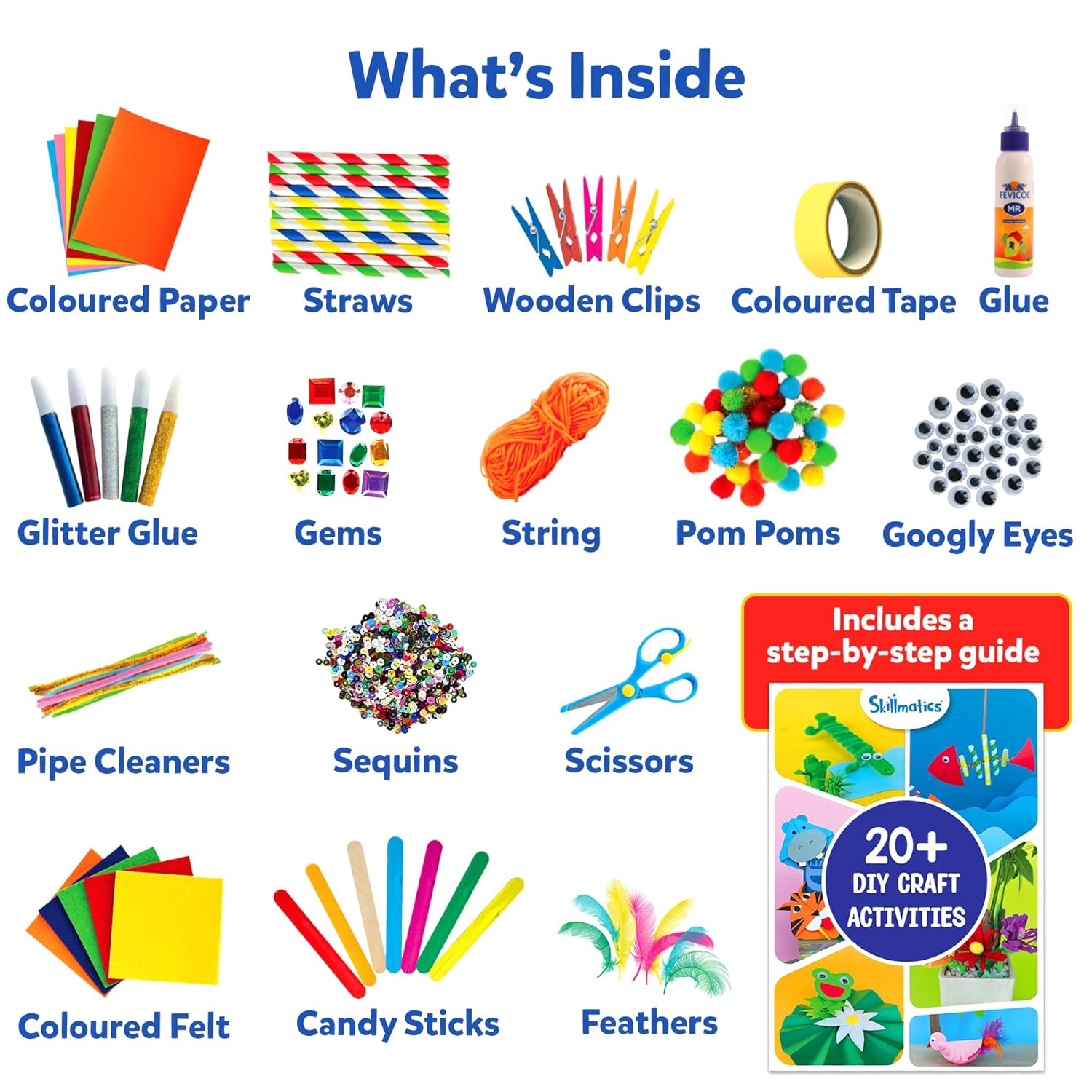 - WHAT'S INSIDE: Step-By-Step Activity Guide, Coloured Paper, Pom Poms, Googly Eyes, String, Pipe Cleaners, Buttons, Coloured Felt, Feathers, Glitter Glue, Coloured Tape, Sequins, Gems, Glue, Straws, Child Safe Scissors, Wooden Clips and Candy Sticks.